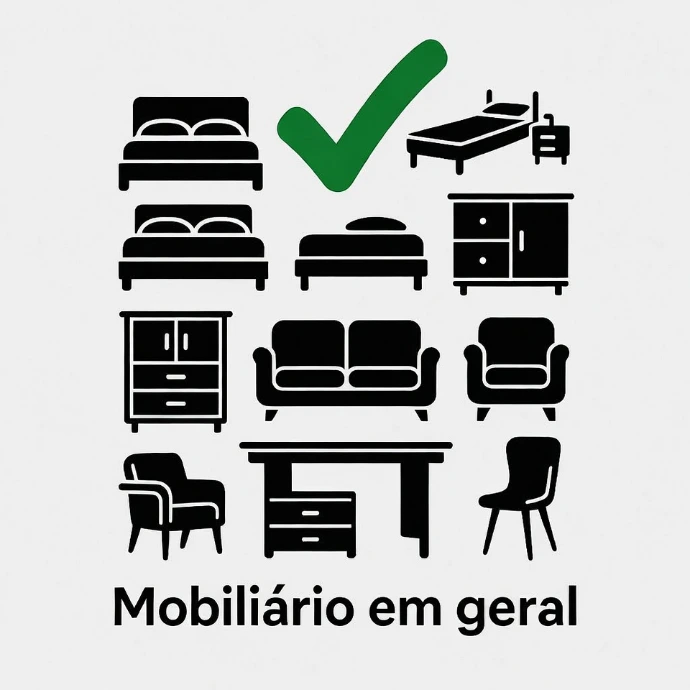 camas, colchões, bases, mesinhas de cabeceira, guarda-fatos, roupeiros, armários, cómodas, cadeiras, bancos, sofás, poltronas, estantes, móveis de sala, mesas de jantar, mesas de centro, aparadores, buffets, cristaleiras, espelhos grandes, cabeceiras de cama