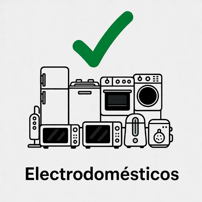 frigoríficos, congeladores, máquinas de lavar roupa, máquinas de lavar loiça, máquinas de secar roupa, microondas, fornos elétricos, fogões, placas de indução, exaustores, aspiradores, aquecedores, ar condicionado portáteis, boilers, máquinas de costura
