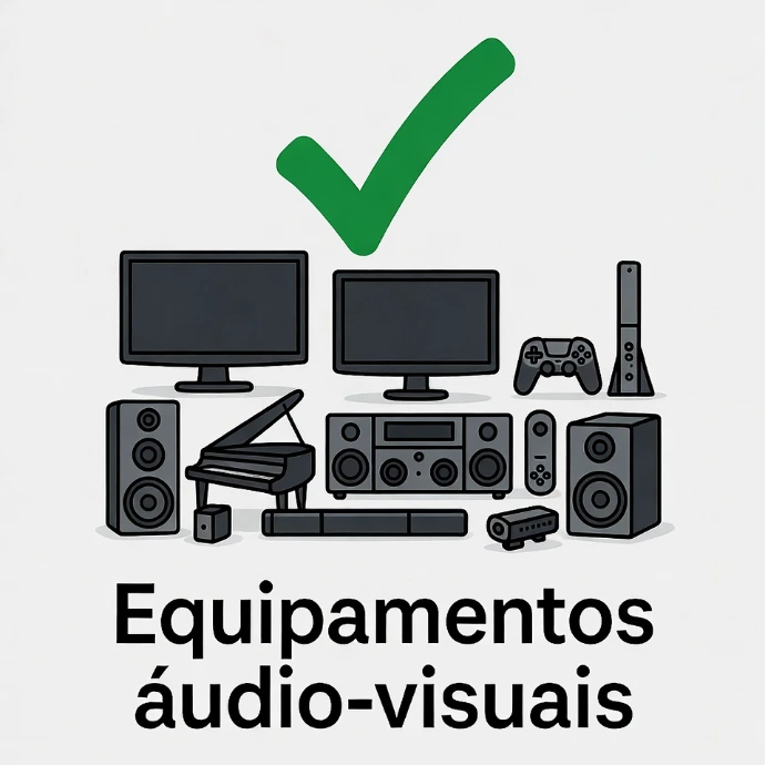 televisores, monitores de computador, projetores de cinema, consolas de jogos, aparelhagens, gira-discos, pianos, órgãos, colunas de som, altifalantes e caixas acústicas, soundbars, amplificadores, subwoofers, leitores de DVD, Blu-ray, CD, equipamentos de home theater, rádios, videogravadores VHS, boxes de TV, mesas de mistura