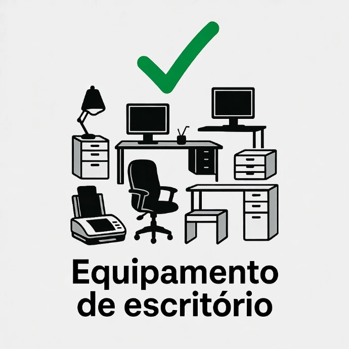 secretárias, mesas de escritório, cadeiras de escritório, estantes de escritório, armários de arquivo, móveis de reunião, impressoras grandes, scanners, móveis de receção