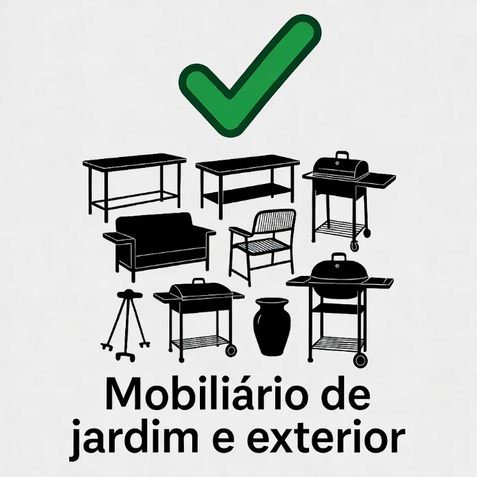 móveis de jardim, mesas e cadeiras de exterior, espreguiçadeiras, guarda-sóis, baloiços, bancos de jardim, churrasqueiras, vasos grandes, vasos de barro, cortadores de relva, ferramentas de jardinagem volumosas