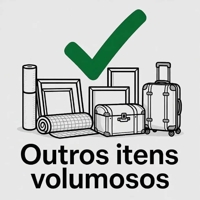 tapetes e alcatifas enroladas, cortinados e varões grandes, quadros e molduras grandes, caixas e baús grandes, malas de viagem grandes, escadas domésticas, aspiradores industriais
