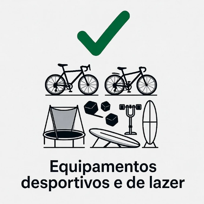bicicletas, bicicletas estáticas, tapetes de corrida, bancos de musculação, pesos e halteres grandes, trampolins, mesas de pingue-pongue, bolas de futebol de tamanho grande, pranchas de surf e bodyboard, equipamento de campismo volumoso
