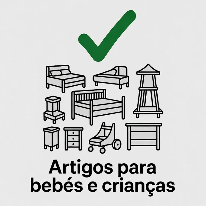 berços, carrinhos de bebé, cadeiras altas, parques de bebé, camas de criança, mesas de mudar fraldas, brinquedos grandes e casinhas de brincar
