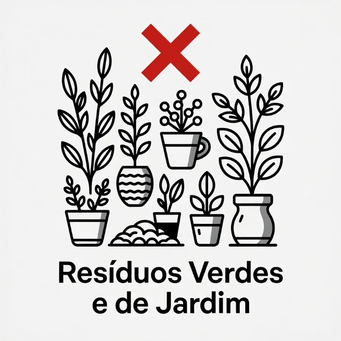 folhas, ramos, podas, relva, terra, vasos com plantas, sacos de adubo, etc